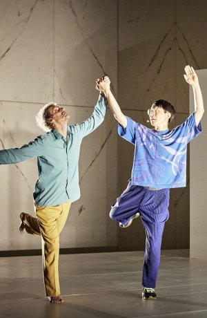 La grâce de Kono atari no dokoka tient à son extrême simplicité et à sa pudeur pleine de respect. Michikazu Matsune raconte et interroge Martine Pisani après avoir mené une investigation sur son travail. Il ressuscite certaines de ses pièces à travers des commentaires, des archives projetées ou en les dansant avec Kooijman. Leur illustration littérale du duo Deux femmes courant sur la plage, créé en 1986 d’après la toile éponyme de Picasso, fait sourire de plaisir tant elle se révèle aussi proche du geste cubiste du peintre que de l’esprit obsédé par l’instabilité de Martine Pisani.